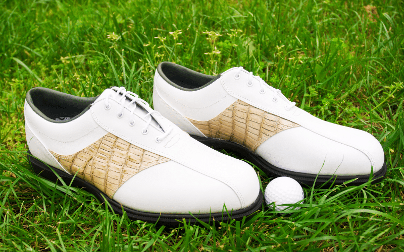 Golf shoes provide stability and traction during the swing, crucial in various terrains encountered on a golf course. The design includes spikes or specialized soles to prevent slipping, thereby enhancing performance and safety.