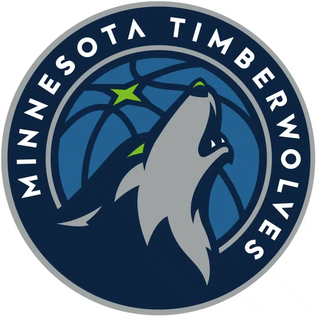 The team colors for Minnesota Timberwolves, distinctively represented in their logo, are midnight blue, lake blue, moonlight grey, and aurora green.